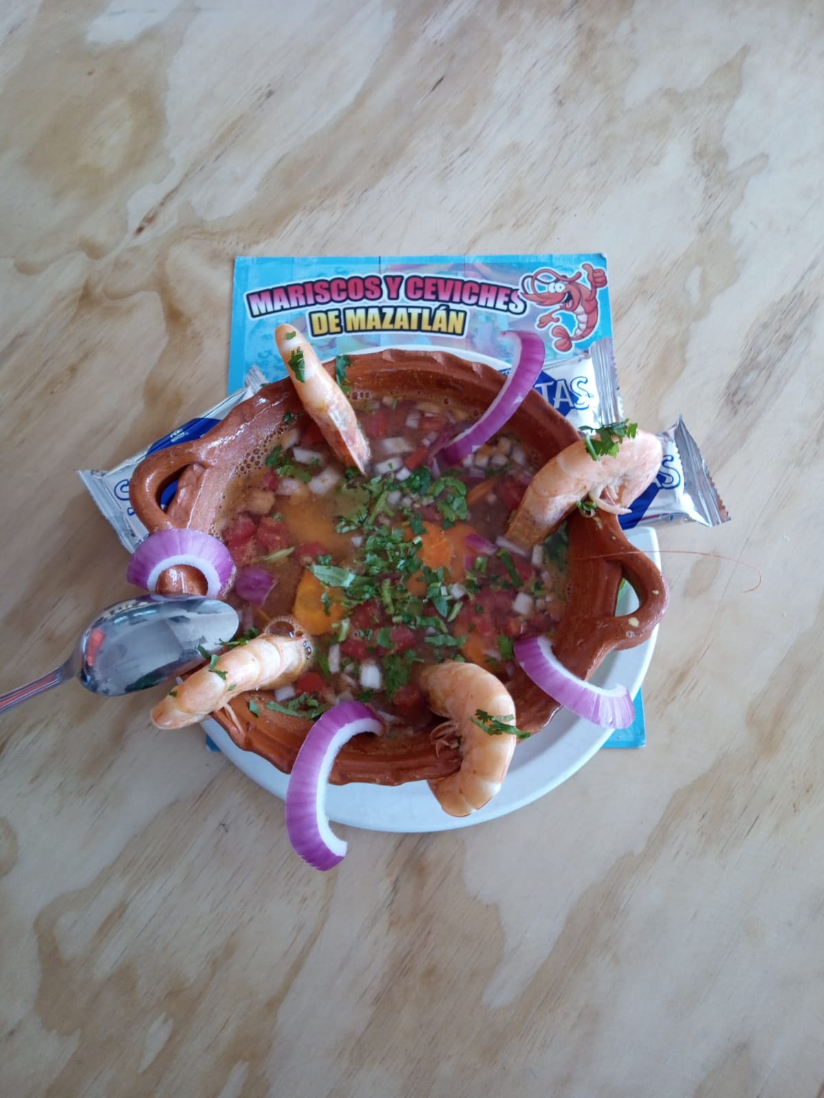 Camarón cocido con camarón, verdura, clamato, verdura.
