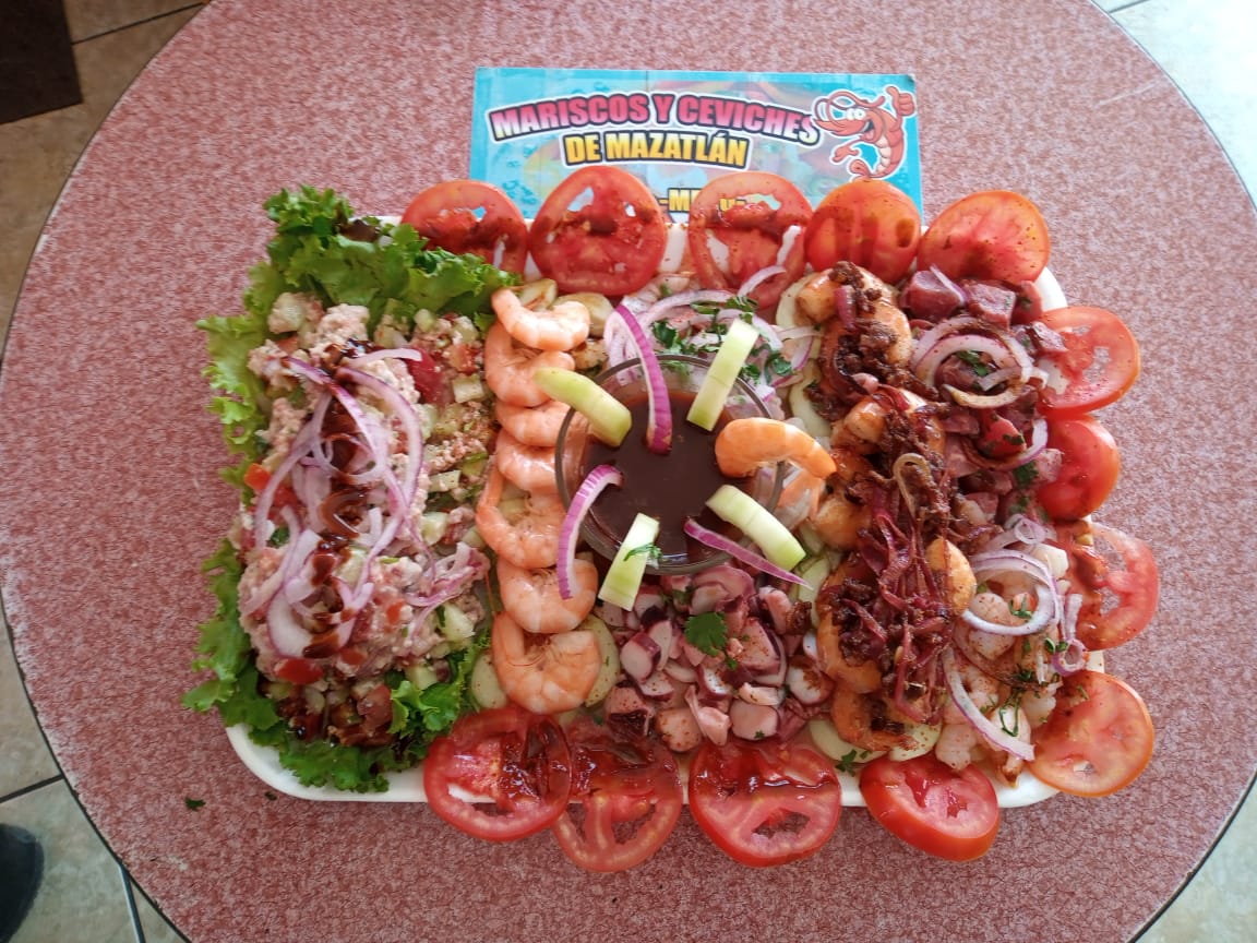 Camaron cocido, ceviche de camaron, camarones guisados a la diabla o al mojo de ajo, camaron empanizado, ceviche de pescado y aguchile.