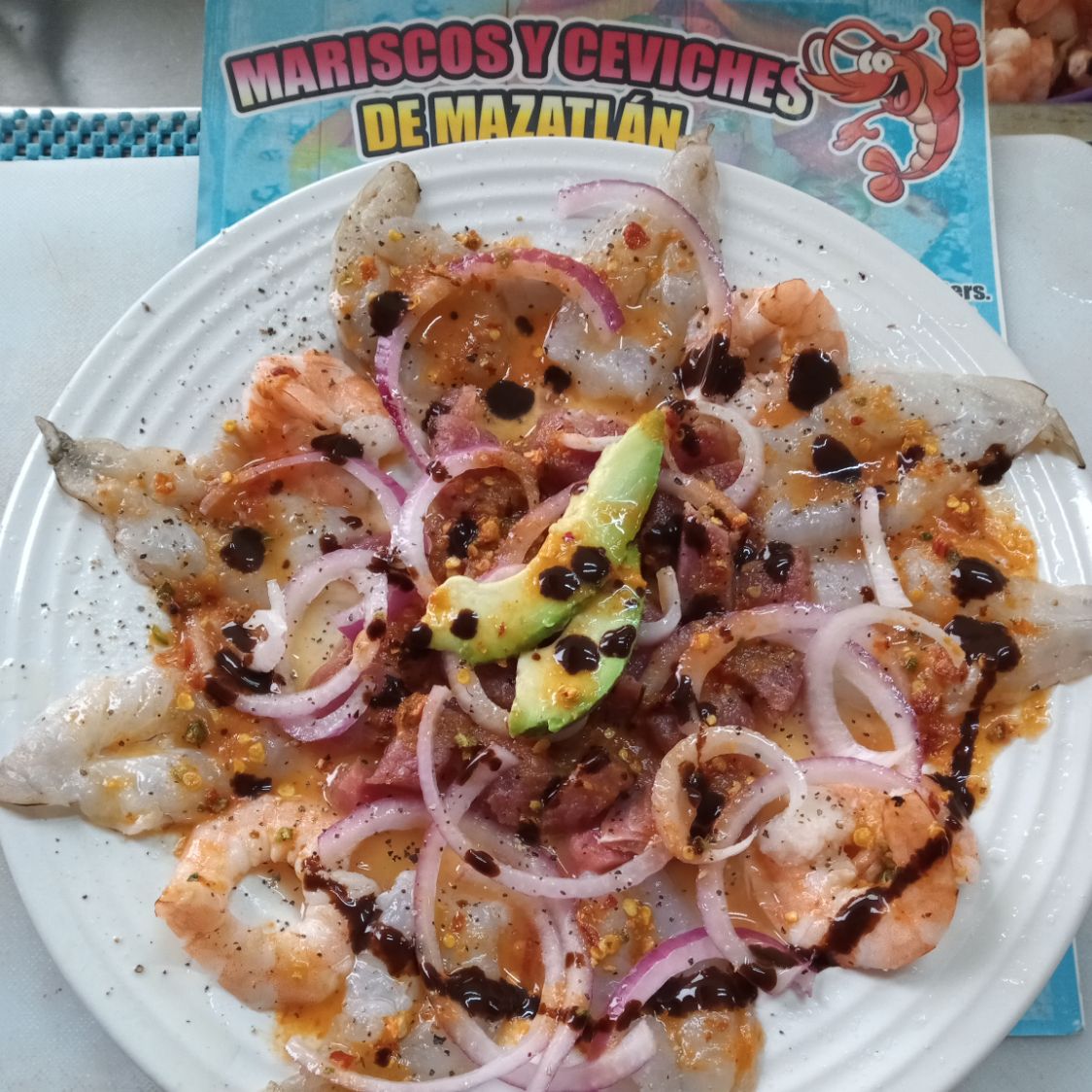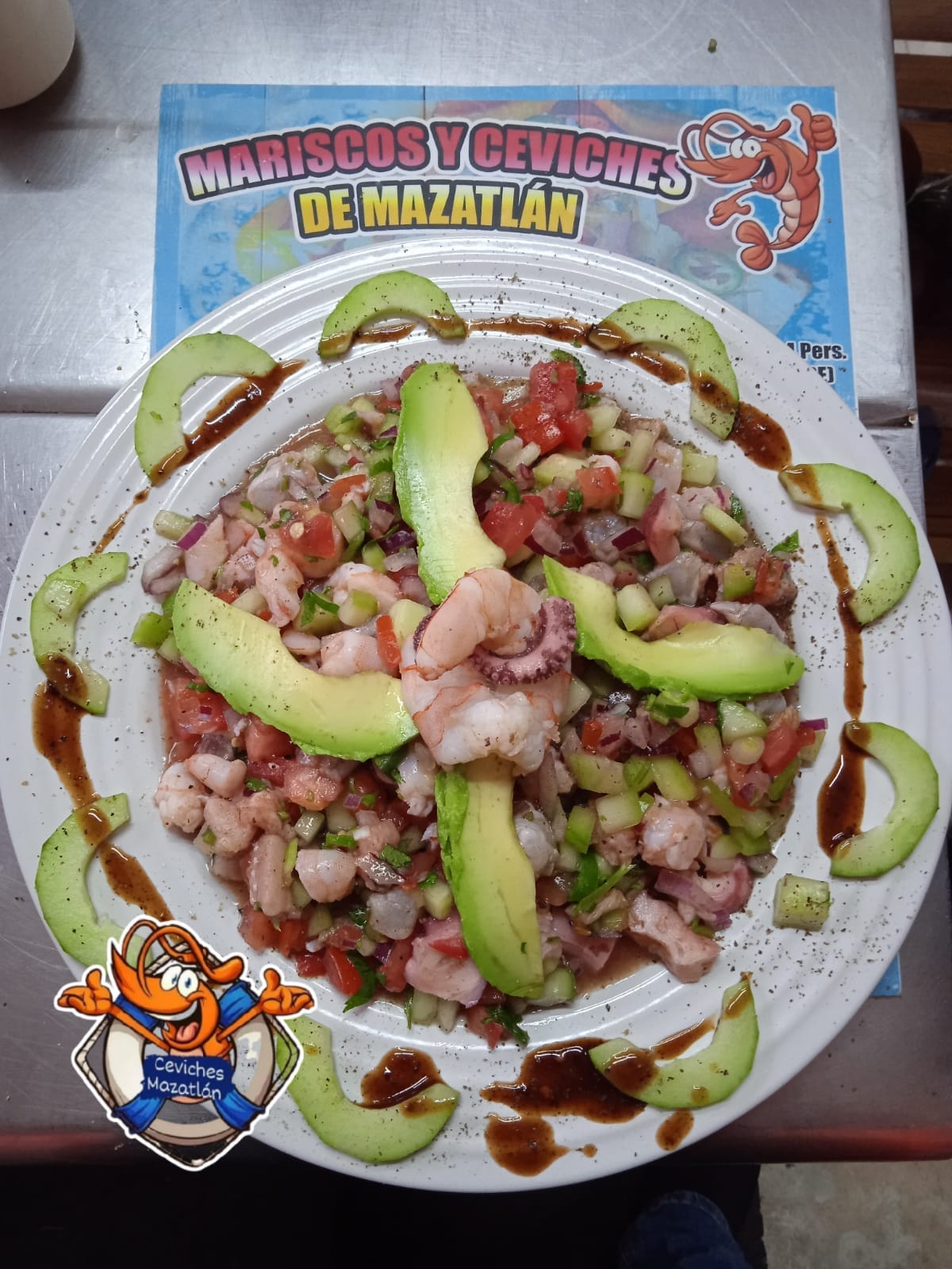 Camarón con Pulpo o caracol con pepino y cebolla morada, cilantro.
