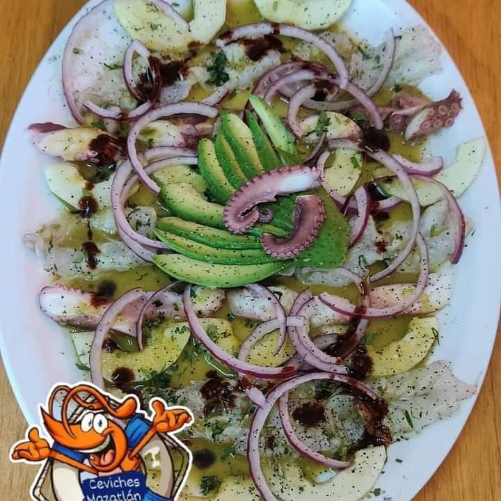 Con pulpo, camaron y caracol, pepino cebolla morada y chile.