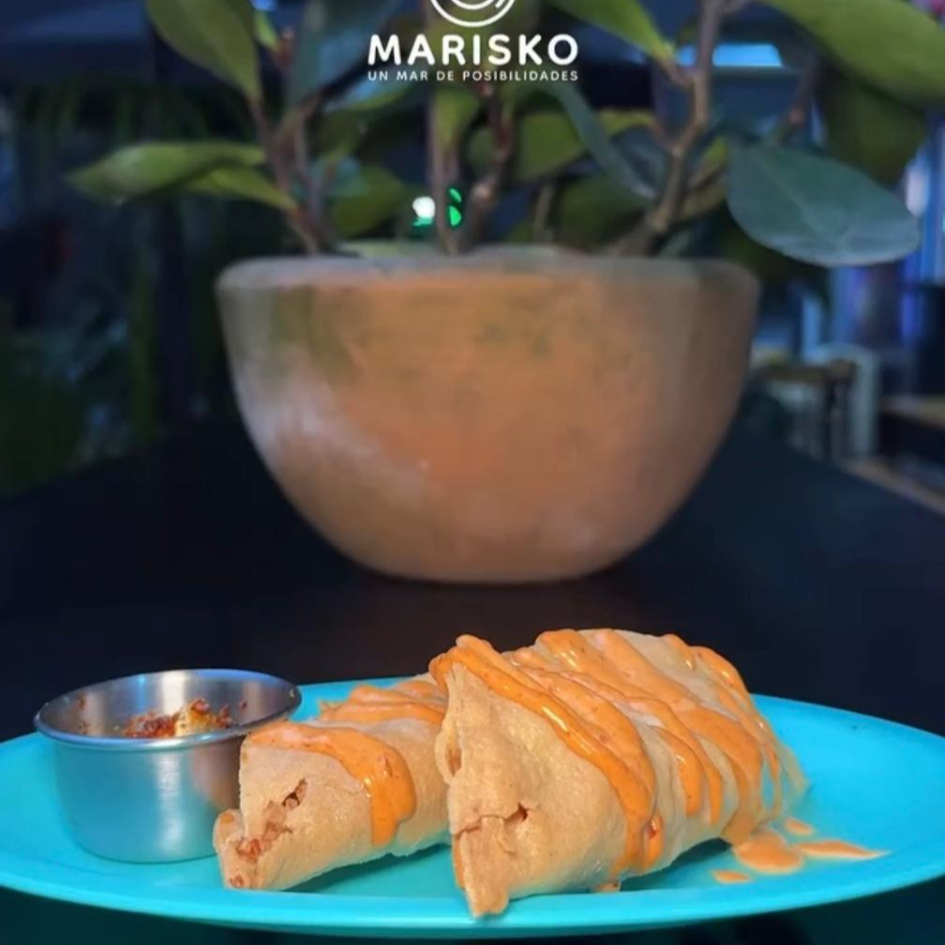 Camarón ala plancha con cebolla, zanahoria y pimientos en Tortilla de queso, exclusiva de Marisko.