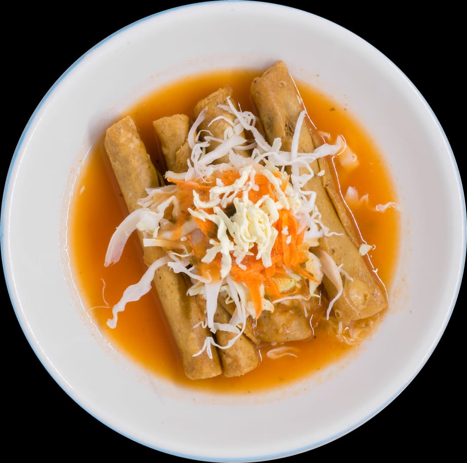 Tacos Dorados De Maíz Bañados En Caldillo De Tomate Con Col, Zanahoria Y Queso Rallado
