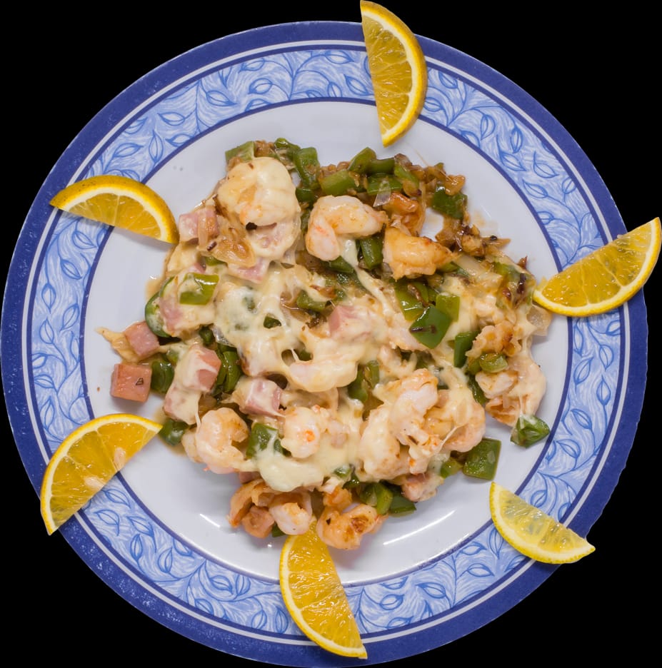 Pimiento Morrón, Cebolla, Tocino, Jamón, Camarón Y Queso Oaxaca, Acompañado De Tortillas De Harina