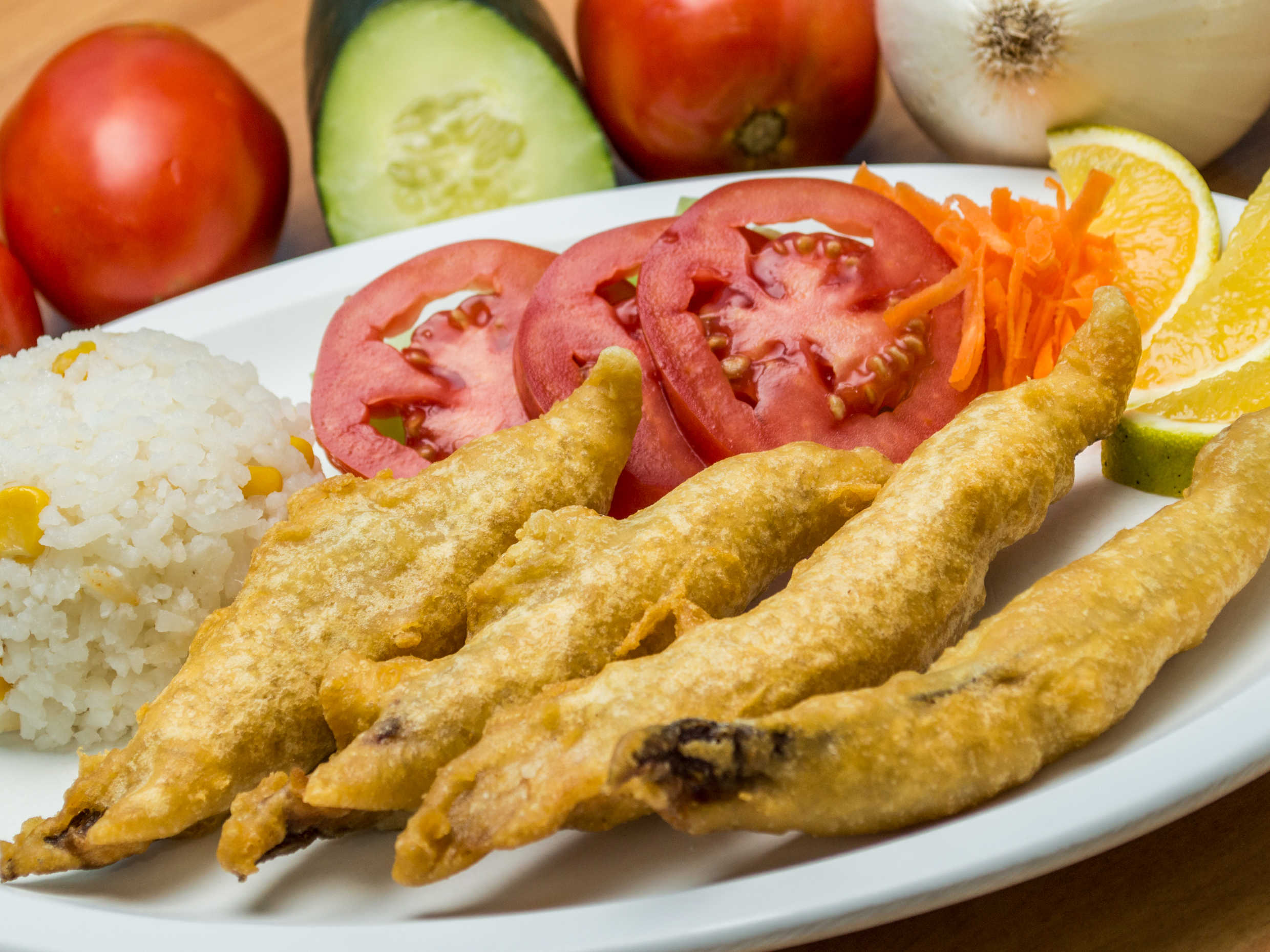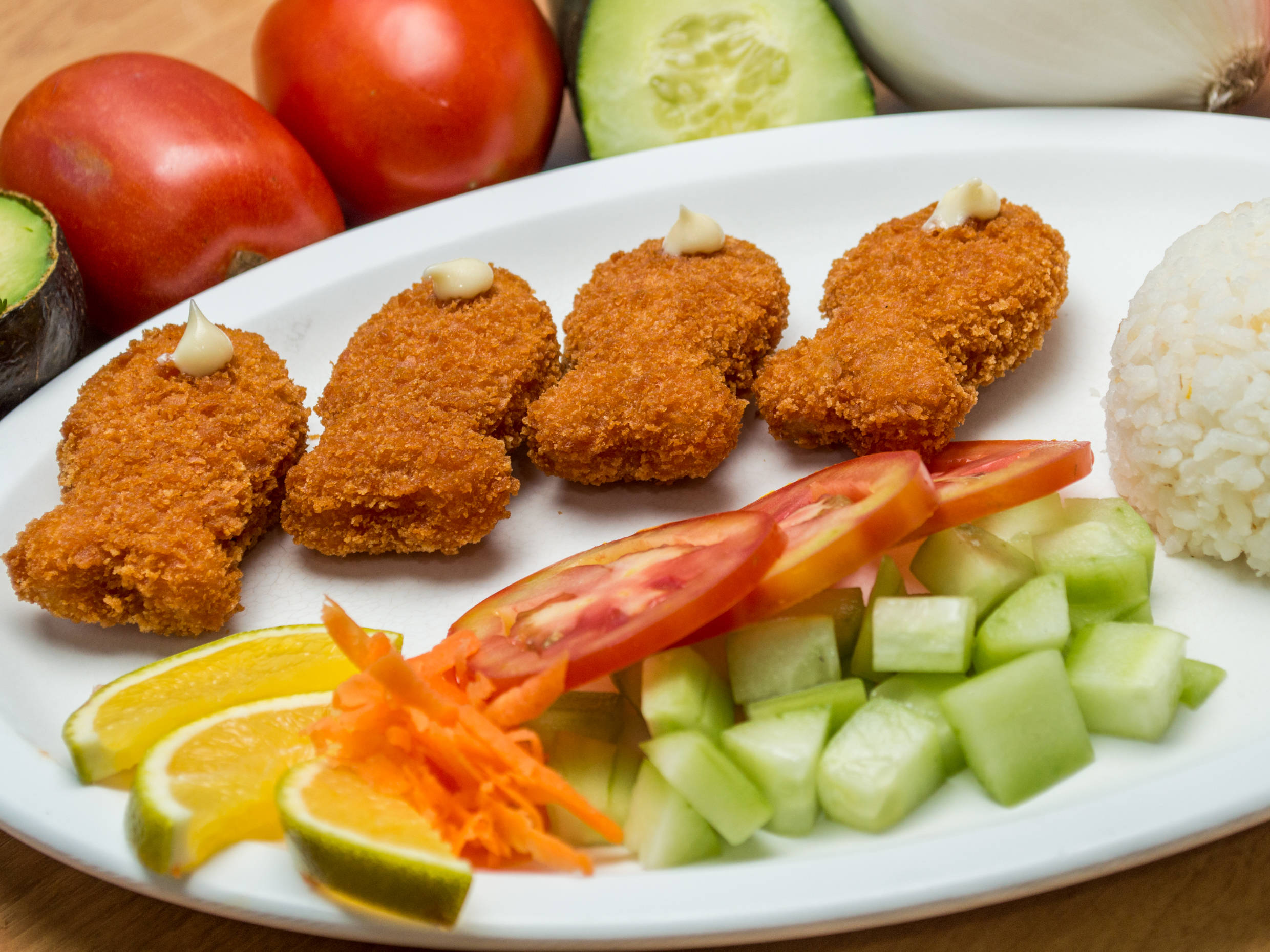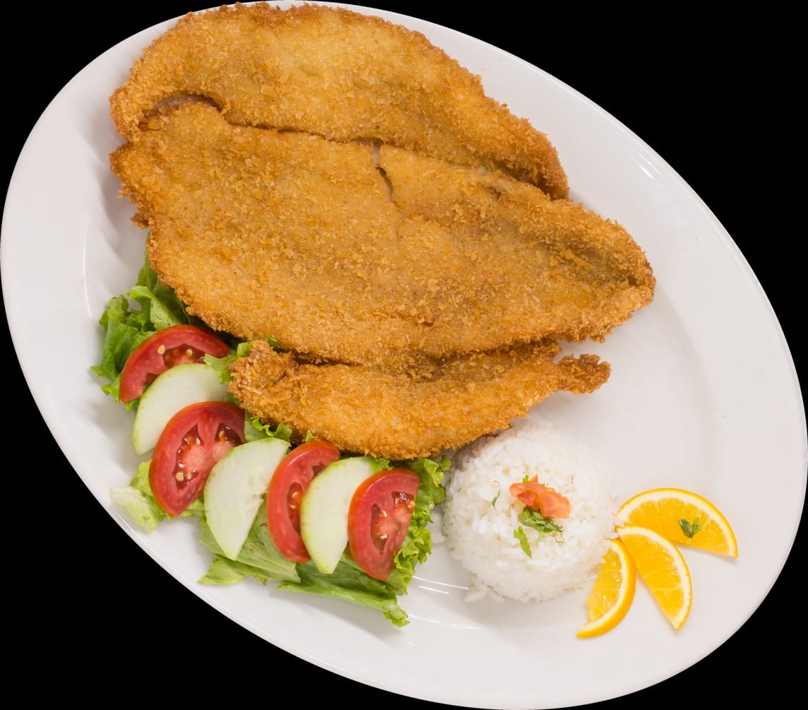Tiritas De Pescado Acompañadas De Arroz Y Ensalada (4 Piezas)