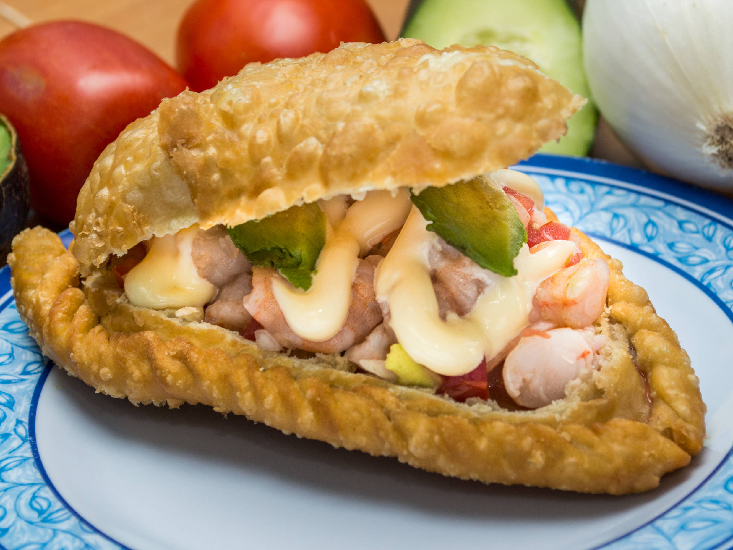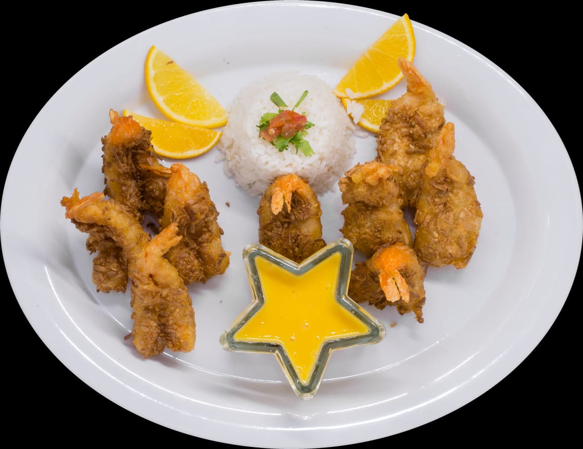 Camarón Capeado Con Tortilla De Maíz, Cebolla, Col Y Pico De Gallo Con Piña
