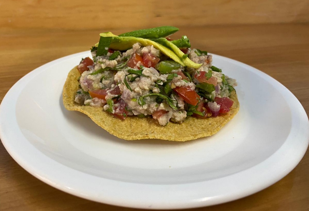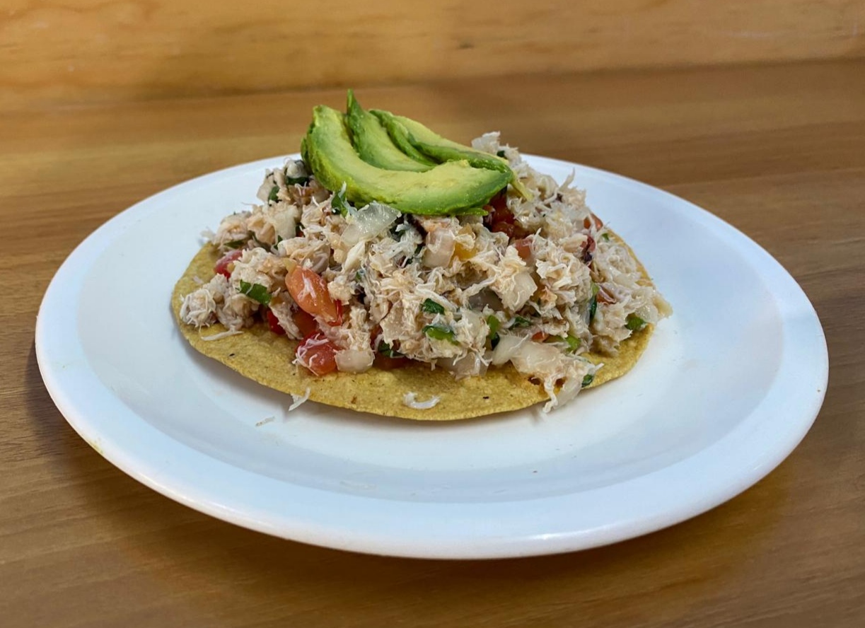 Tostada Con Base De Mayonesa, Jaiba Y Camarón Cristal Marinado