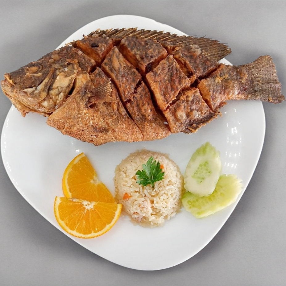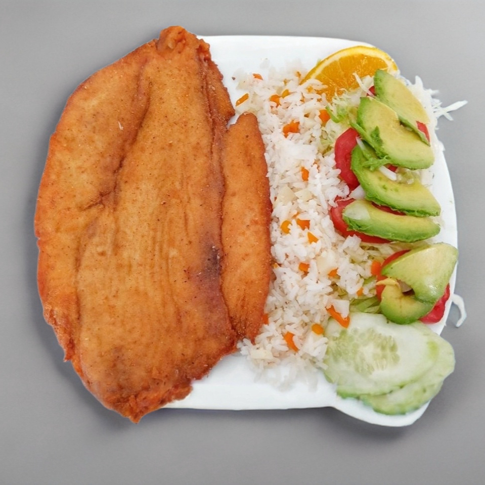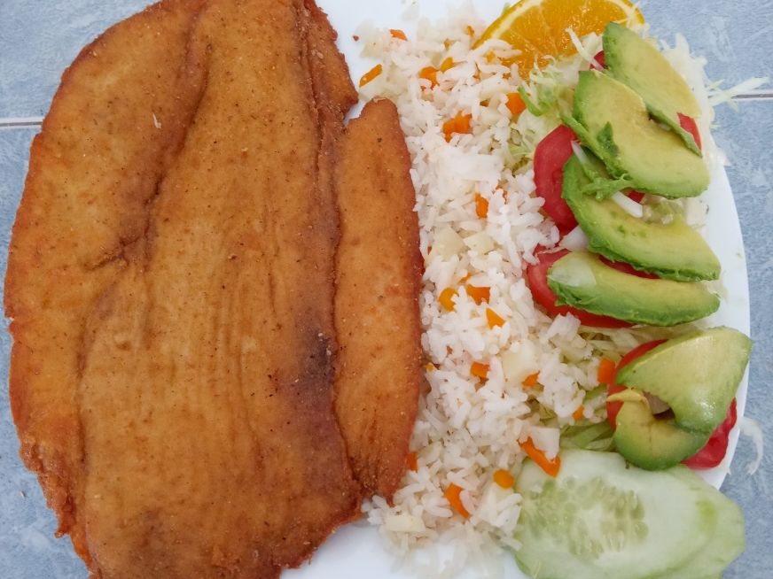 Mojarra de 900 gr frita Acompañada de arroz y ensalada de lechuga