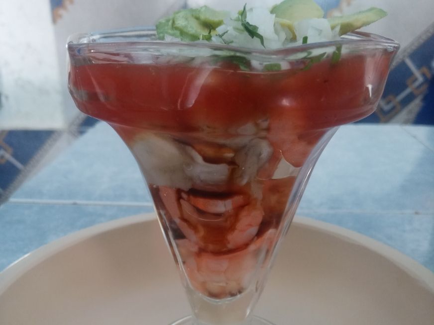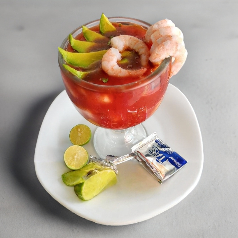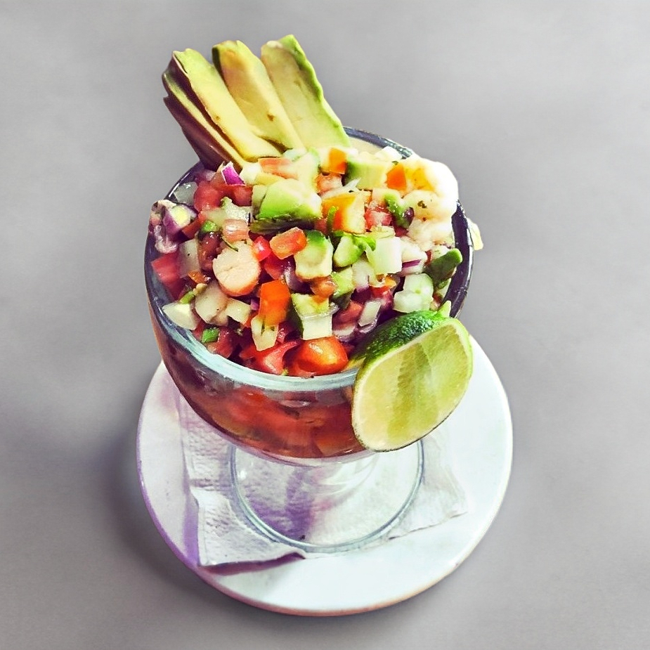 Camarón, calamar, callo, surimi, ostión, pescado, jaiba, almeja, todo sazonado con chile cuaresmeño y cebolla, gratinada con quesillo, servida con cebolla y cilantro.