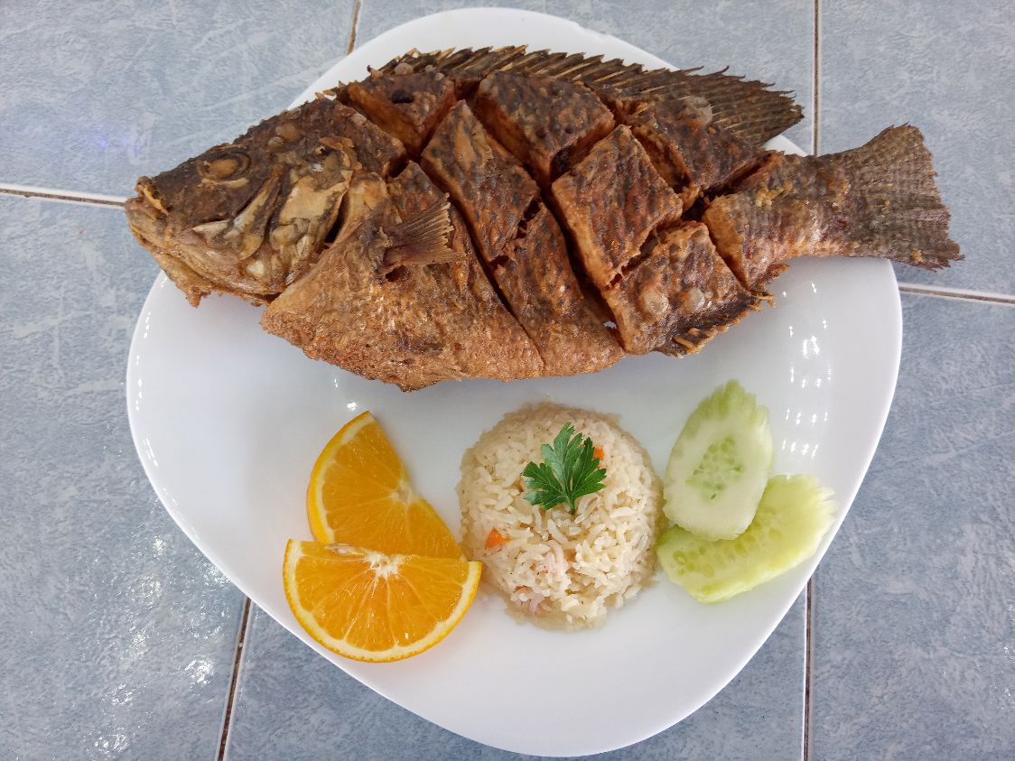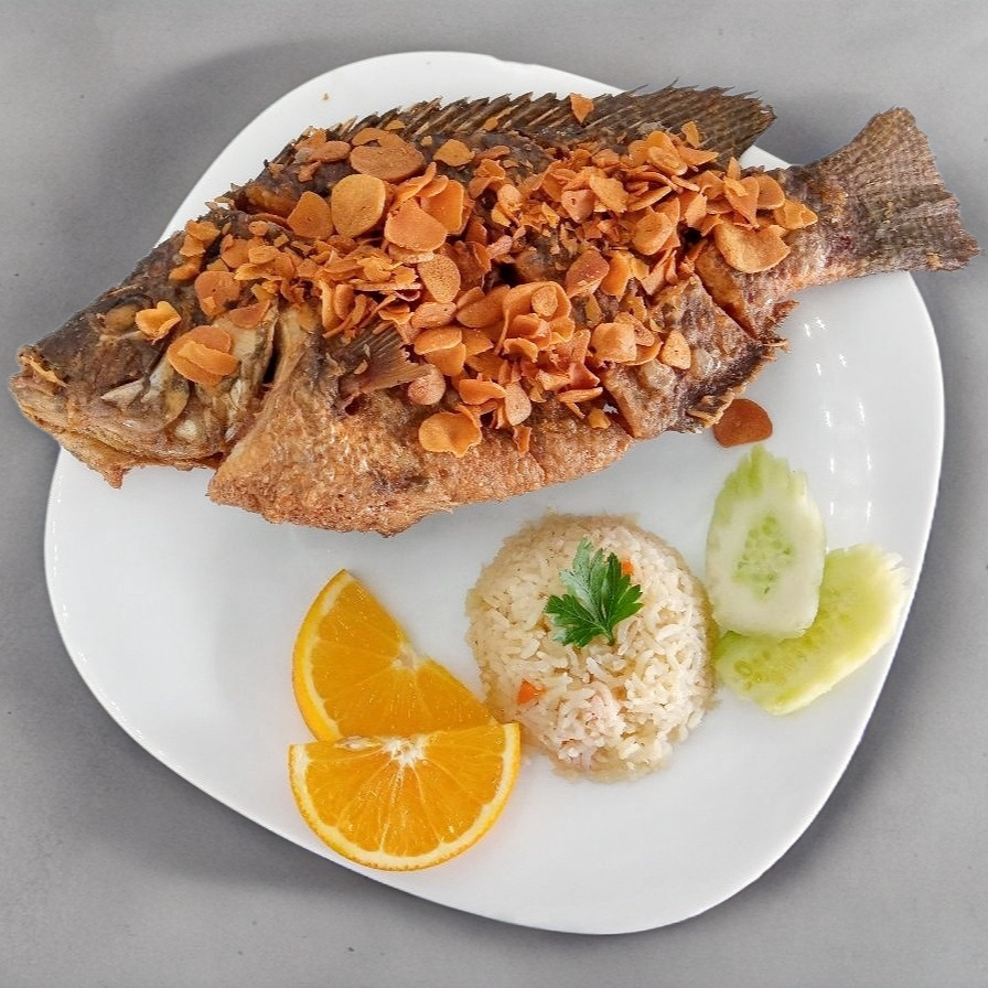 Mojarra de 900 gr servida con ojuelas de ajo doradas acompañada de arroz y ensalada de lechuga