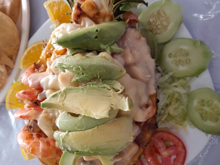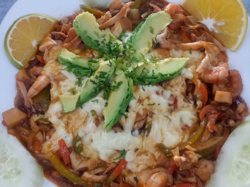 Camarón, calamar, callo, surimi, ostión, almeja, pimiento morrón, cebolla, jitomate, gratinado con quesillo.
