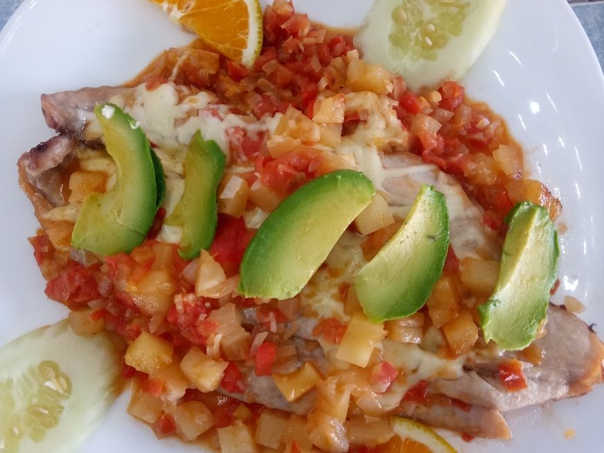 Mojarra de 900gr cocida en caldo y preparada con chile güero y aceituna