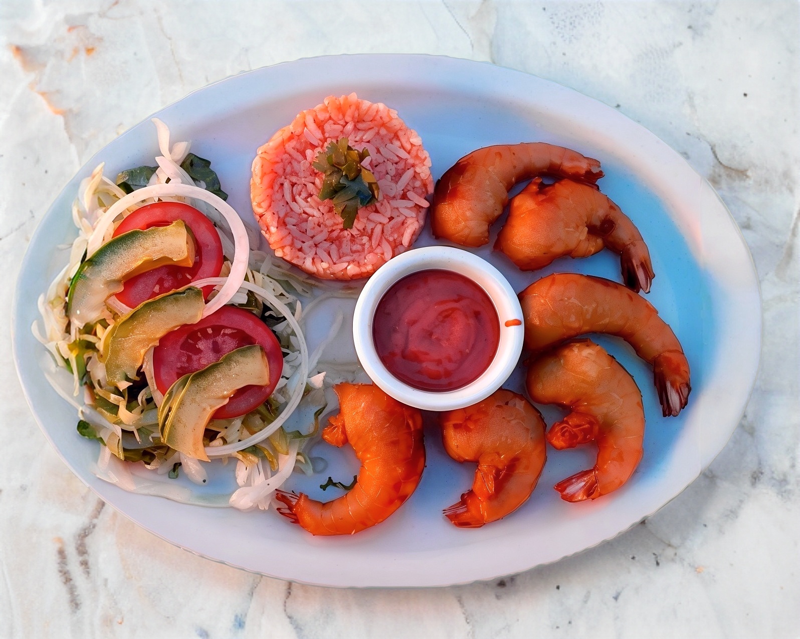 Camarones cocidos con Harina, acompañado de aderezo, Ensalada Verde y Arroz Rojo.