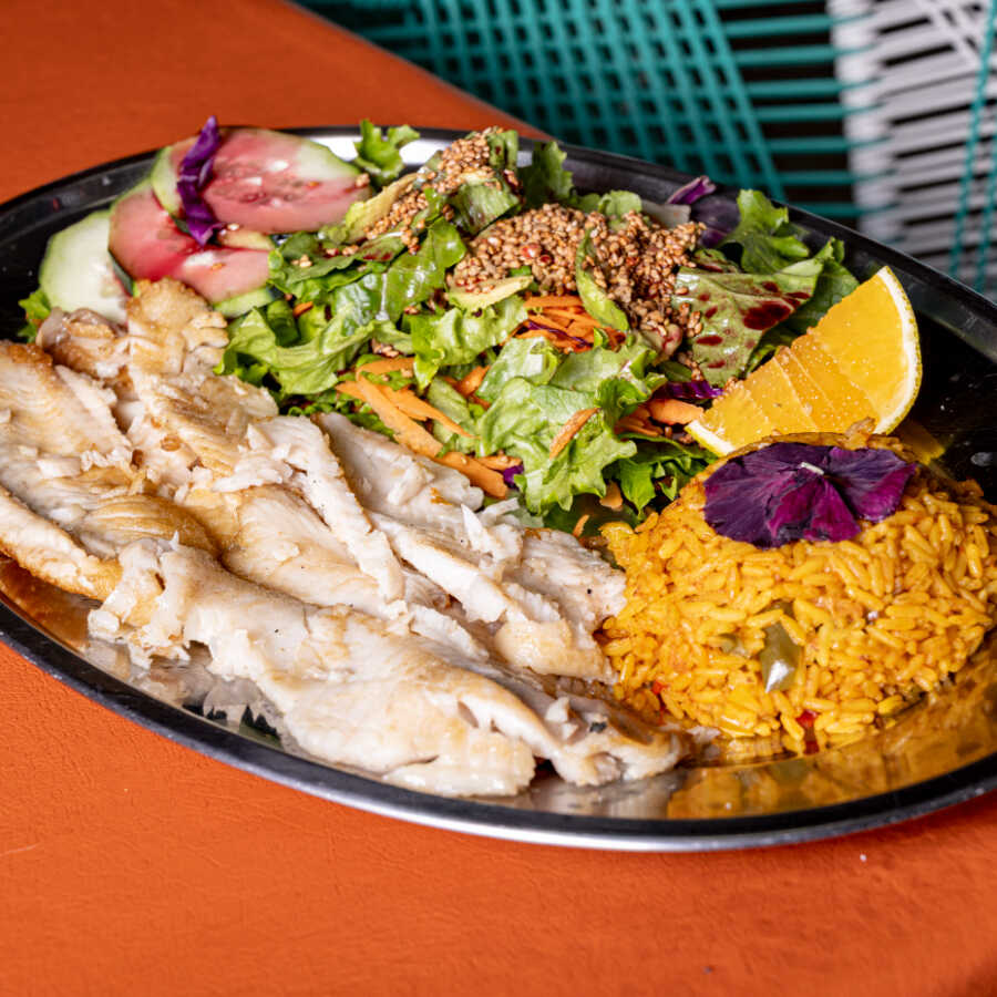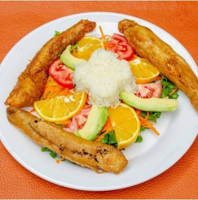 Filete tilapia, sin espinas. Acompañado de ensalada y arroz.