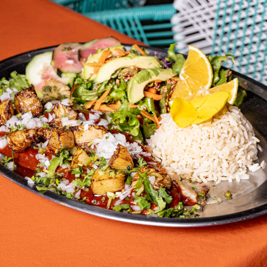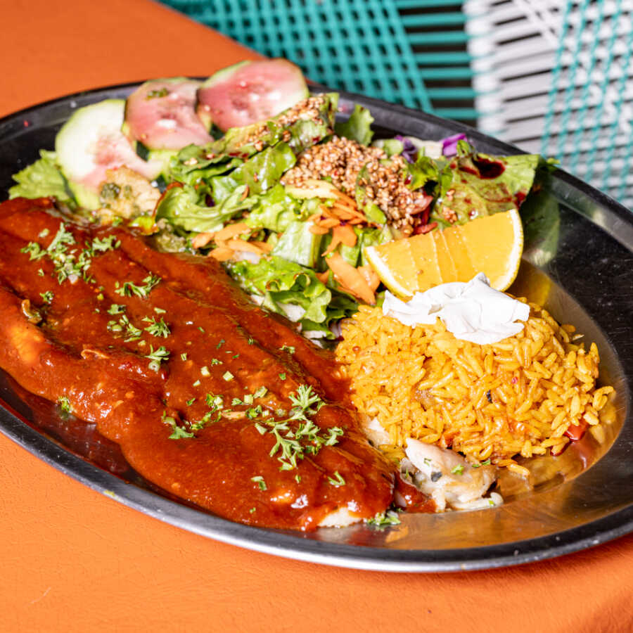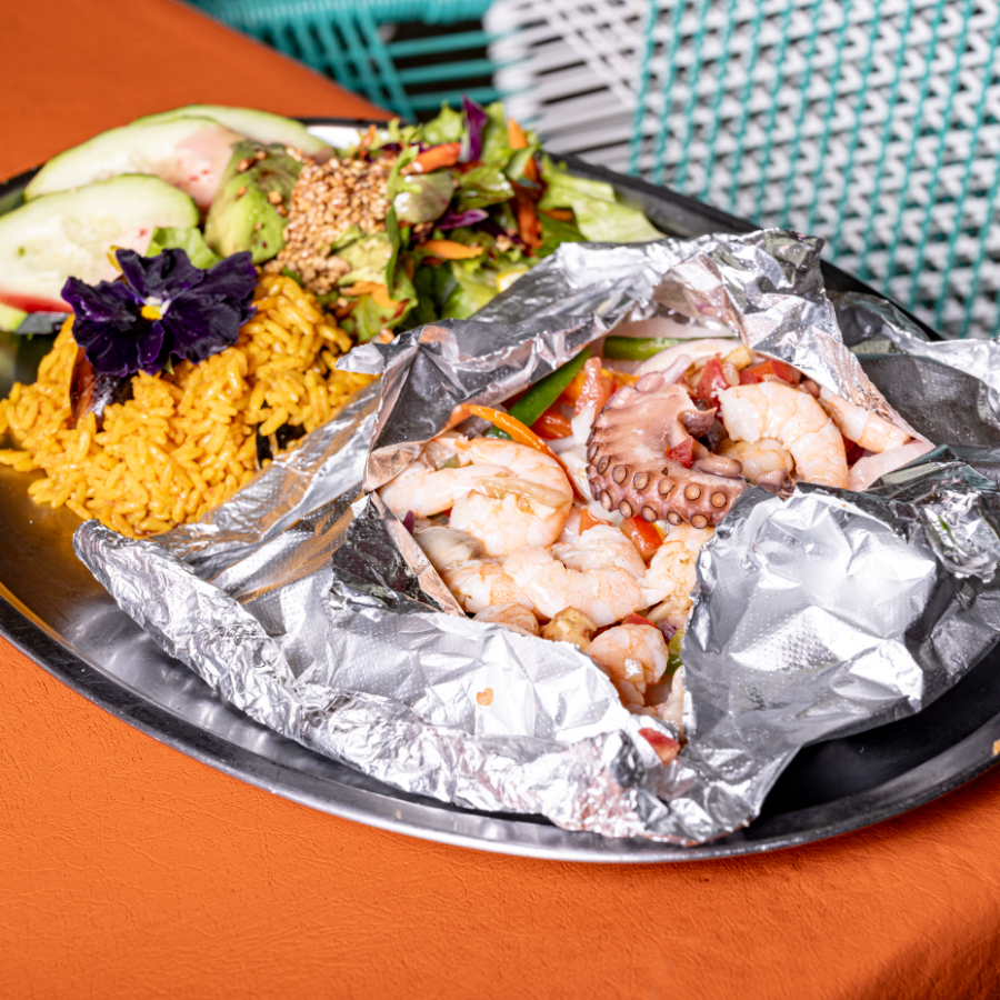 2 Porciones de filete tilapia bañadas en nuestra salsa al pastor acompañado de ensalada y arroz.