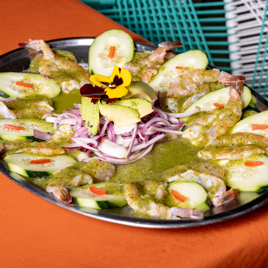 Delicioso mix de ceviche de camarón, pulpo, pescado, atún fresco, pepino, cebolla morada y mango, fresco y delicioso.