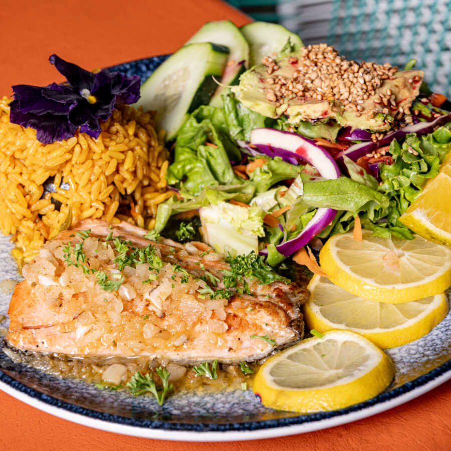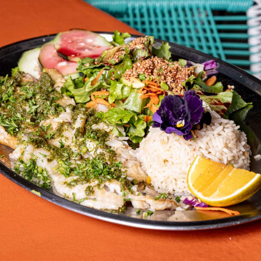 2 Porciones de filete tilapia bañado en nuestra salsa pesto, acompañado de ensalada y arroz.