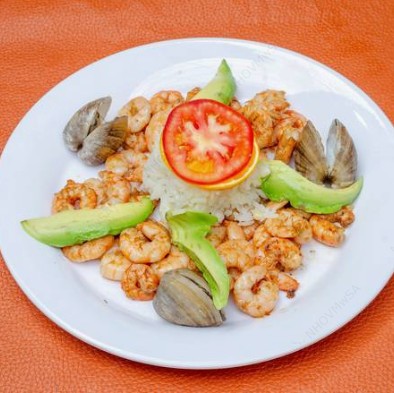 Camarón, pescado, calamar y jaiba, cocidos al vapor. Acompañados de ensalada y arroz.
