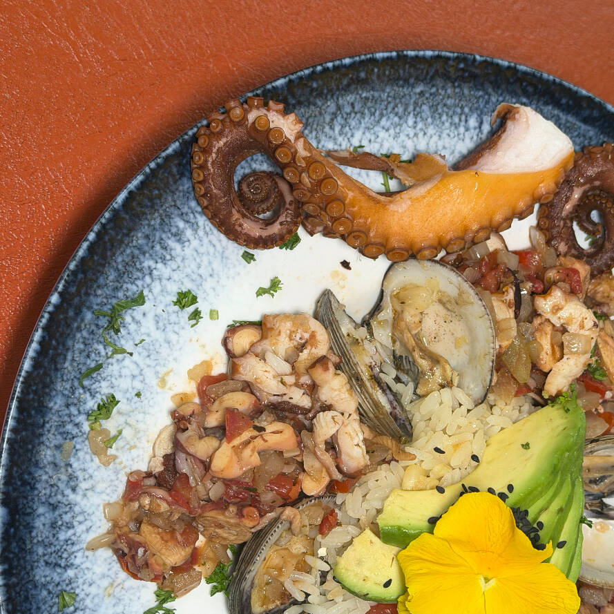 Deliciosa y abundante combinación de chile morrón, cebolla, camarón, ostión, pulpo, pescado y pescado gratinado con queso.