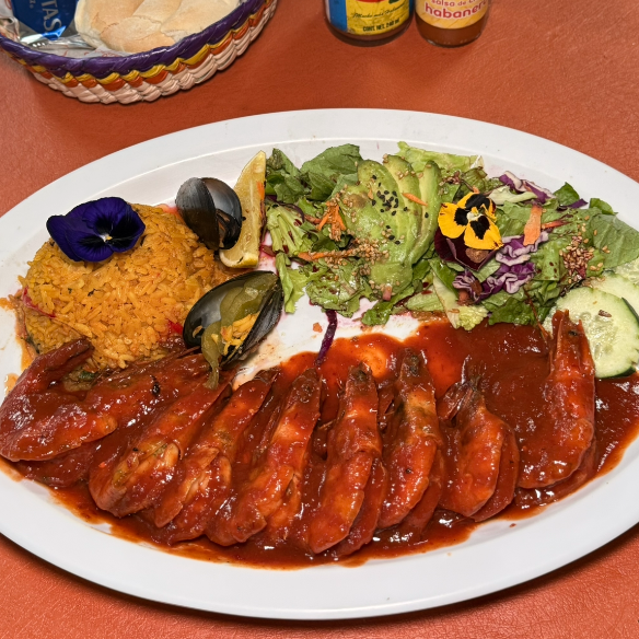 Deliciosos camarones, acompañados de ensalada y arroz.