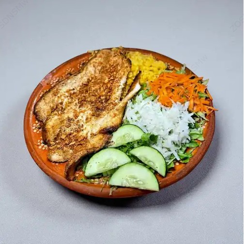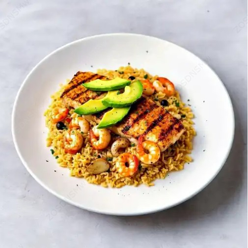 Arroz con rica mezcla de mariscos (camarón, pulpo, calamar y surimi) encobijado de un filete a la plancha sazonado y rodajas de aguacate; acompañado de un consomé chico del día y una sangría.