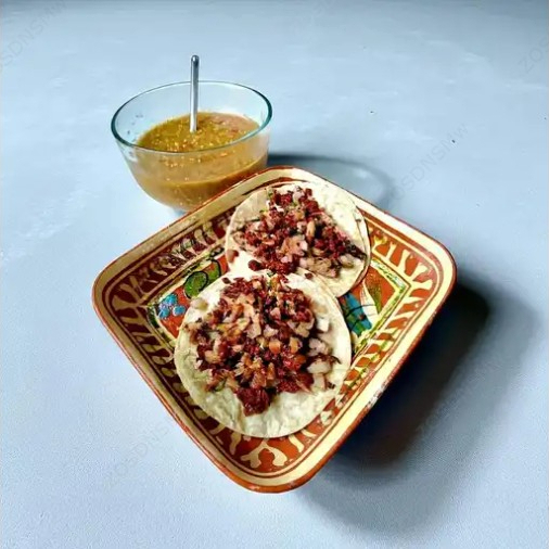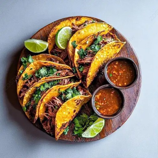 Tortillas de maíz, generalmente pasadas por aceite caliente, arrachera, 4 pzas servidas con cebolla, cilantro, queso y crema.