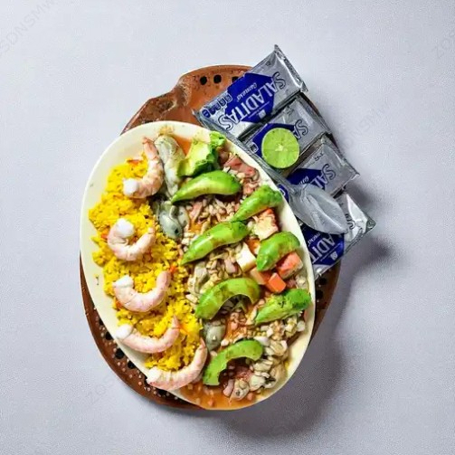 Mezcla de camarón, surimi, pulpo, calamar, pescado y ostión acompañado con arroz.