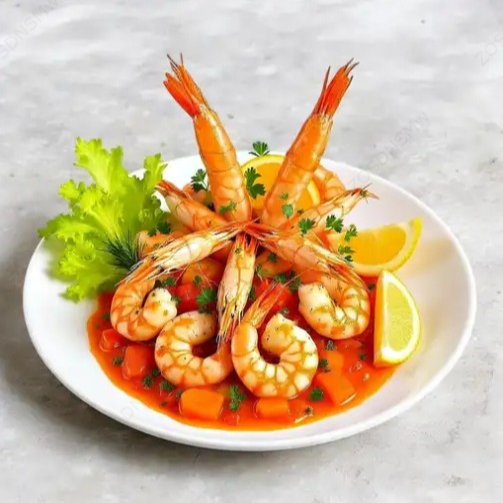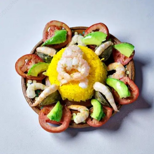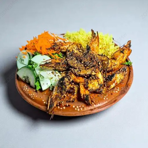 Arroz sazonado cocido con camarones, jitomate, cebolla, ajo y especias, acompañado de verduras de la casa.
