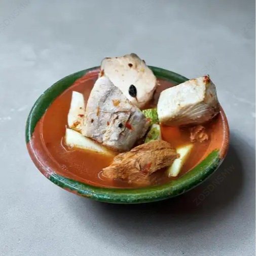Sopa preparada con camarón, pescado, pulpo, almejas y calamar, cocinados en un caldo de jitomate con verduras, ajo y especias; servida con cebolla, cilantro, limón y tortillas.