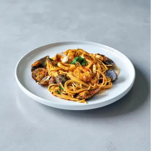 Espagueti cocido al dente acompañado de una salsa cremosa de mariscos con camarón, pulpo, almeja y calamar, sazonada con ajo, jitomate y especias.