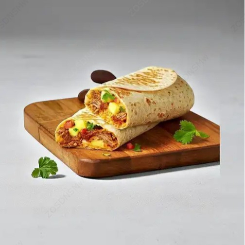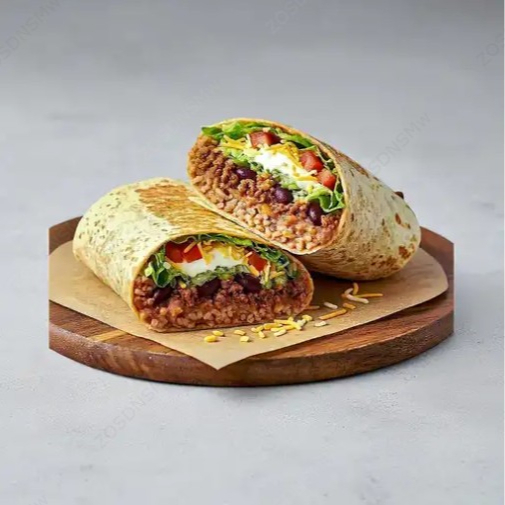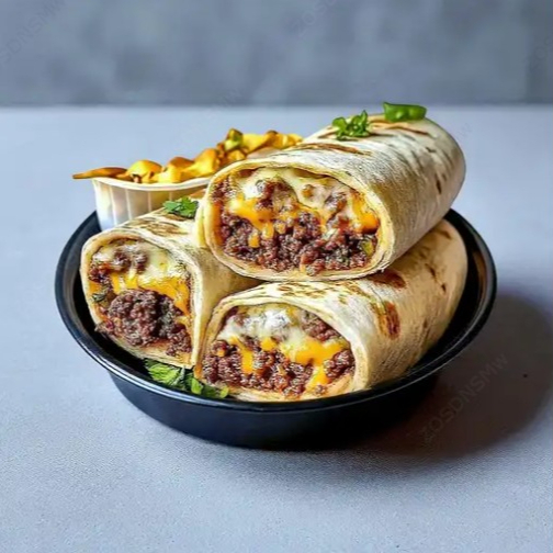 Tortilla de harina rellena de bistec, pastor, chorizo, piña asada, arroz, frijoles y queso fundido.