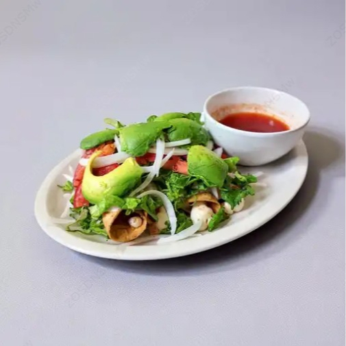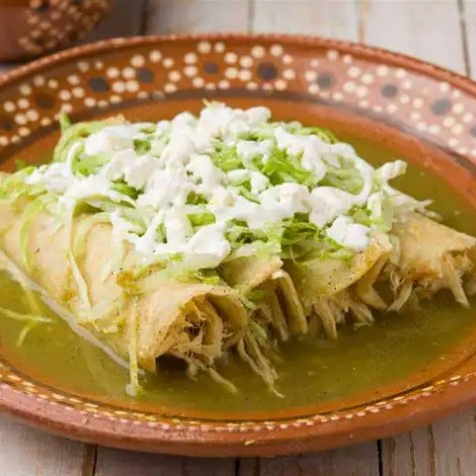 Tortillas de maíz, generalmente pasadas por aceite caliente con pollo, 4 pzas servidas con cebolla, cilantro, queso y crema.