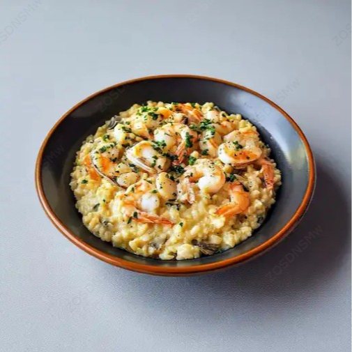 Arroz sazonado con camarones, mezclado con queso fundido.