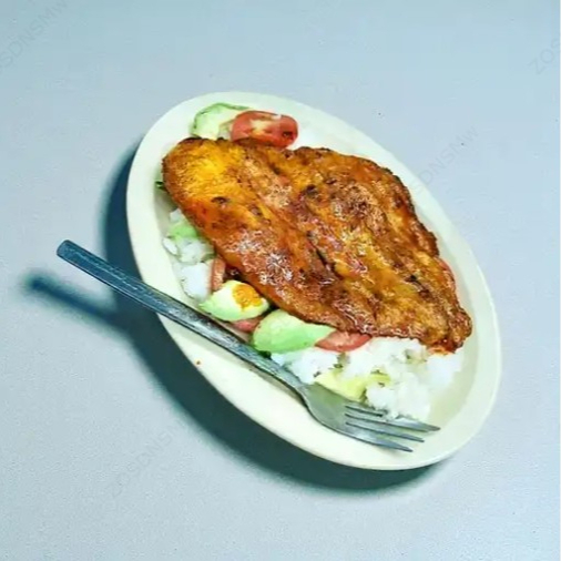 Filete frito en aceite acompañado de una porción de arroz y ensalada.
