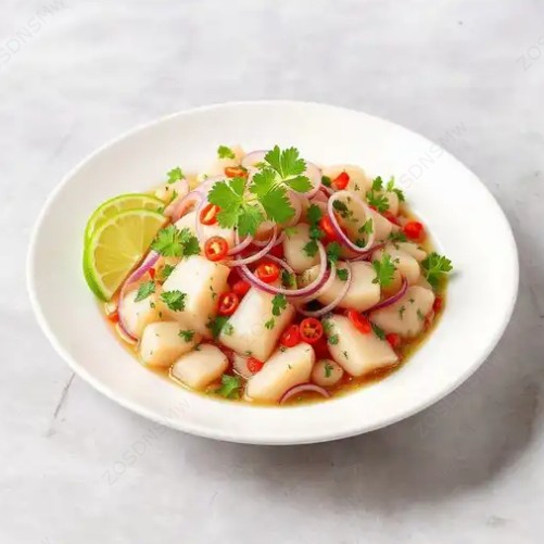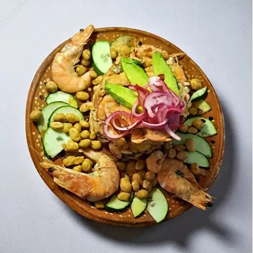 Camarón cocido en limón, mezclado con callo, pepino, mango, cebolla morada, cilantro y chile serrano.