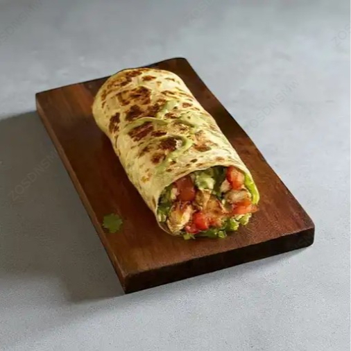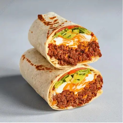 Mezcla de pollo, bistec, chorizo, arroz, frijoles, queso, cebolla y salsa en tortilla de harina.