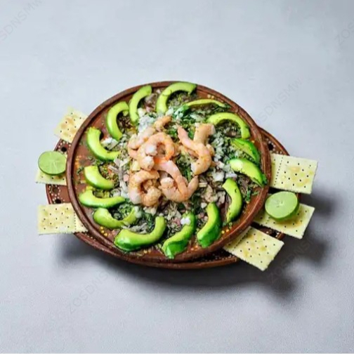 Mezcla de camarón, pulpo, almeja y pescado en salsa coctelera con jitomate, cebolla, cilantro, pepino y jugo de limón.