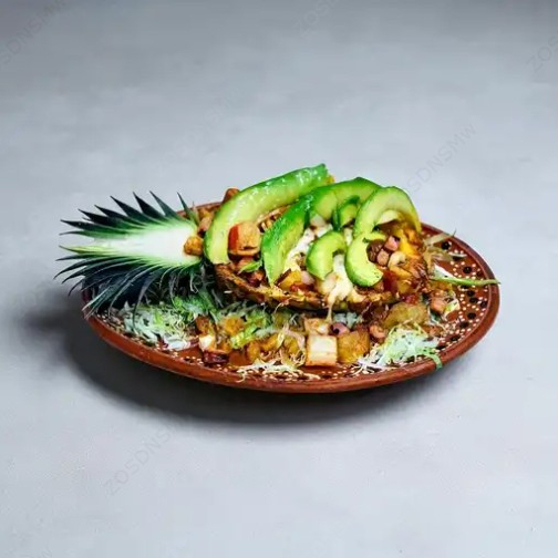 Piña flameada rellena con mariscos, bañada en salsa chipotle y queso gratinado al horno.