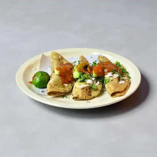 Tortillas de maíz, generalmente pasadas por aceite caliente en bistec, 4 pzas servidas con cebolla, cilantro, queso y crema.