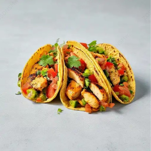 Tortilla de maíz con pollo a la plancha, cebolla, cilantro y salsa al gusto, servidos con acompañamiento a elegir.
