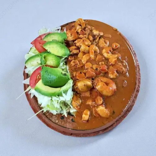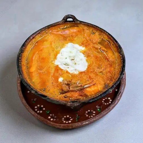 Camarón pelado, almejas y queso gratinado, cocinados en caldo de jitomate, cebolla y especias, servida con arroz y tortillas.