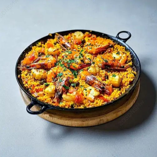 Arroz estilo paella cocido con camarón, jaiba, almeja, salchicha, pollo y tocino, sazonado con especias tradicionales.
