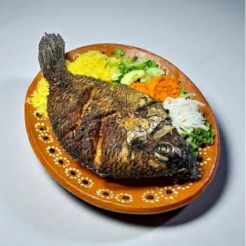 Jaiba, almeja, camarón, pulpo, calamar, surimi y ostión bañados en salsa diabla con queso gratinado, acompañados de mojarra frita, servido con arroz y tortillas.