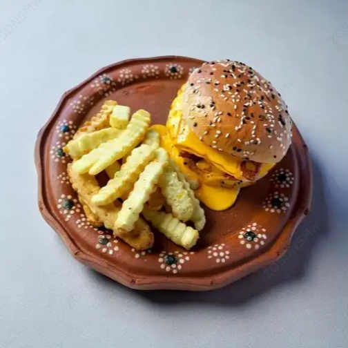 Hamburguesa servida con mix de quesos (queso crema, manchego y queso líquido), con champiñones, tocino con jitomate, acompañado de papas a la francesa.