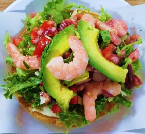 Camarones frescos sobre una crujiente tostada con una ligera capa de mayonesa y lechuga. Con cilantro, jitomate, cebolla y aguacate. El toque perfecto de cátsup realza su sabor. (Aparte) Salsa valentina y limon.