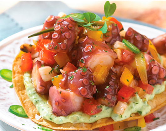 Una mezcla irresistible de camarones y pulpo frescos con cilantro, jitomate, cebolla y aguacate. Todo en una base crujiente con un toque de cátsup, con una ligera capa de mayonesa y lechuga. (Aparte) Salsa valentina y limon.