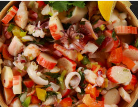 Surimi suave y delicioso sobre una crujiente tostada con una ligera capa de mayonesa y lechuga. , acompañado de cilantro, jitomate, cebolla y aguacate. Bañado en nuestra mezcla especial de cátsup. (Aparte) Salsa valentina y limon.