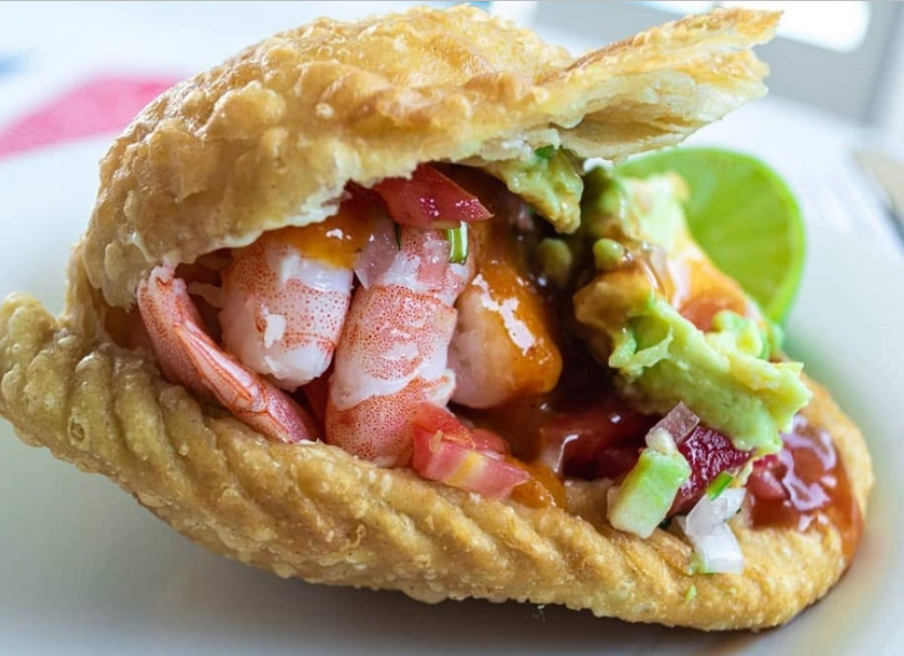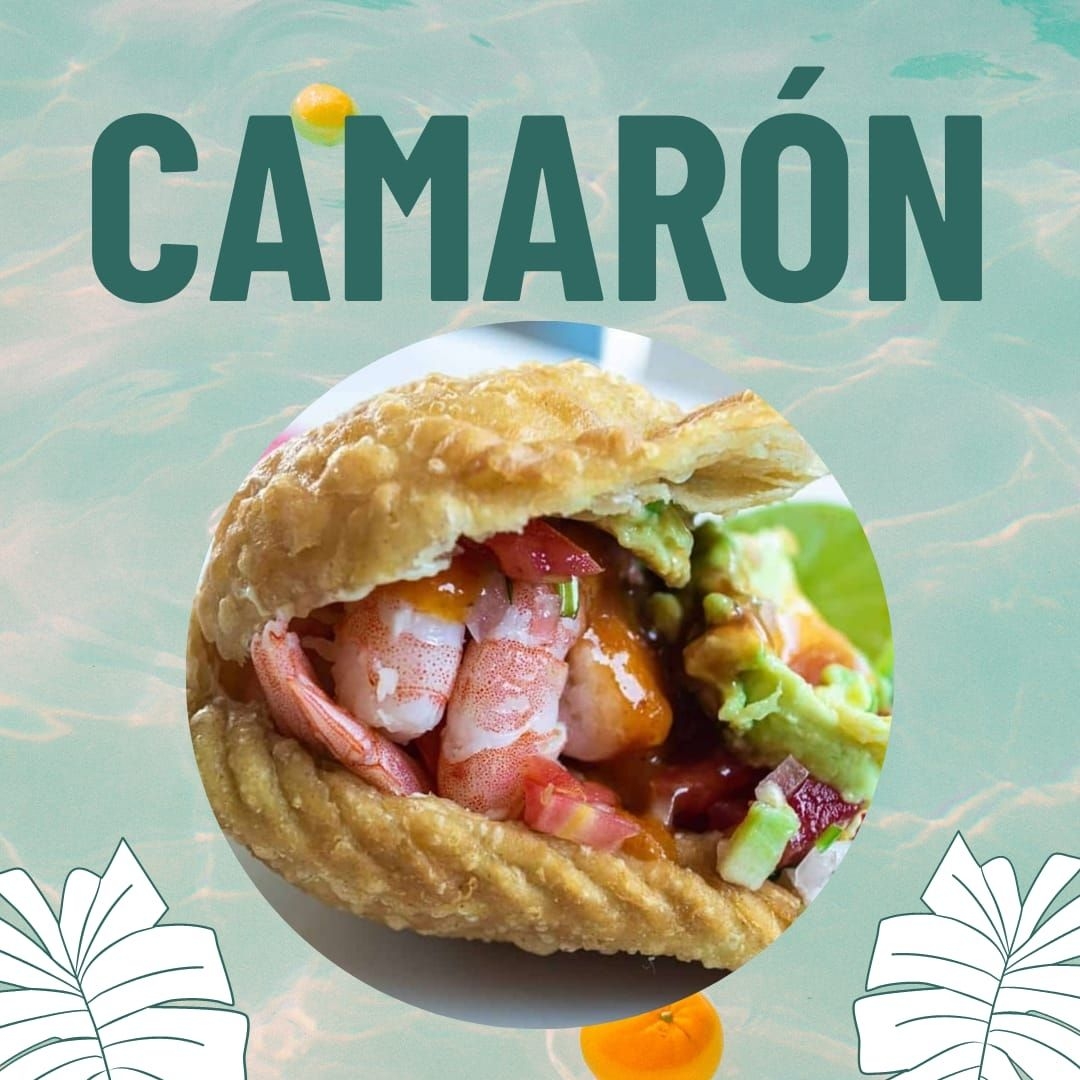 Camarones jugosos en una empanada dorada y crujiente, perfecta para los amantes del mar. Un bocado lleno de frescura. Por dentro con cilantro, jitomate, cebolla, aguacate y mayonesa. Un clásico lleno de sabor. (Aparte) Salsa valentina, catsup y limon.
