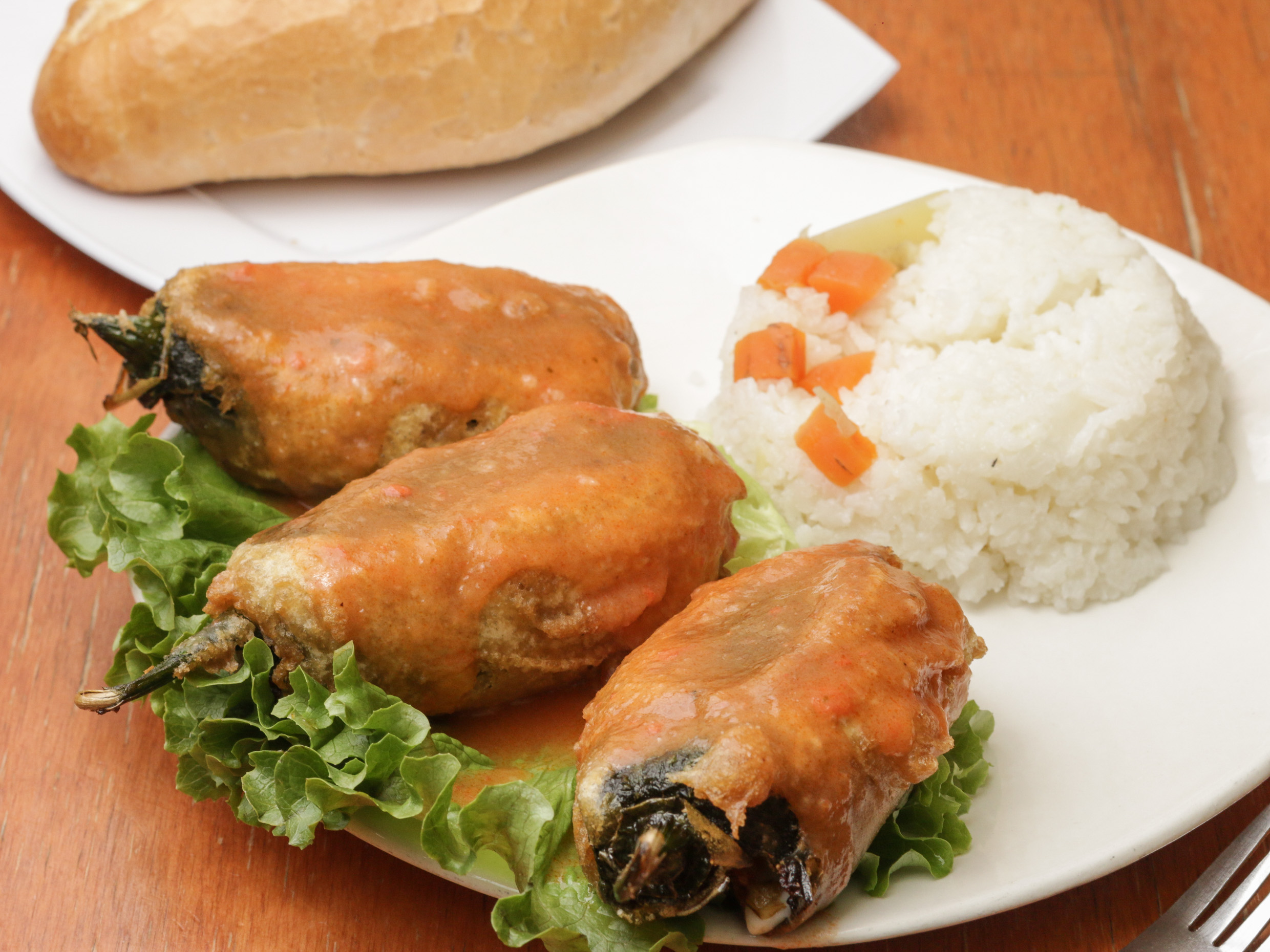 Orden de 3 chiles cuaresmeños rellenos de camarón y queso, acomapañados de arroz y salsa de jitomate.