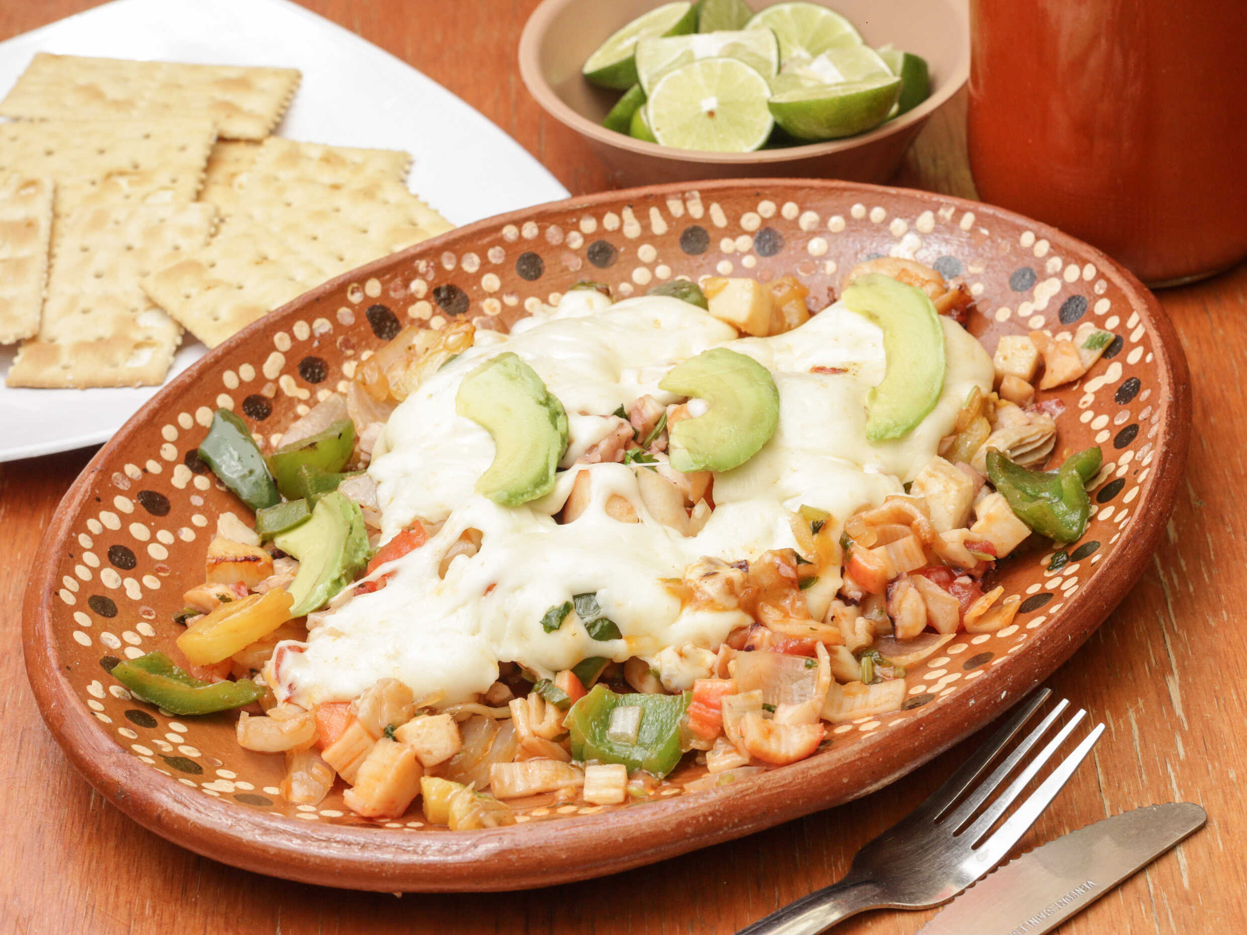 Mariscos guisados con mantequilla, cebolla, chile morrón. Gratinados con queso oaxaca y 3 rebanadas de aguacate.