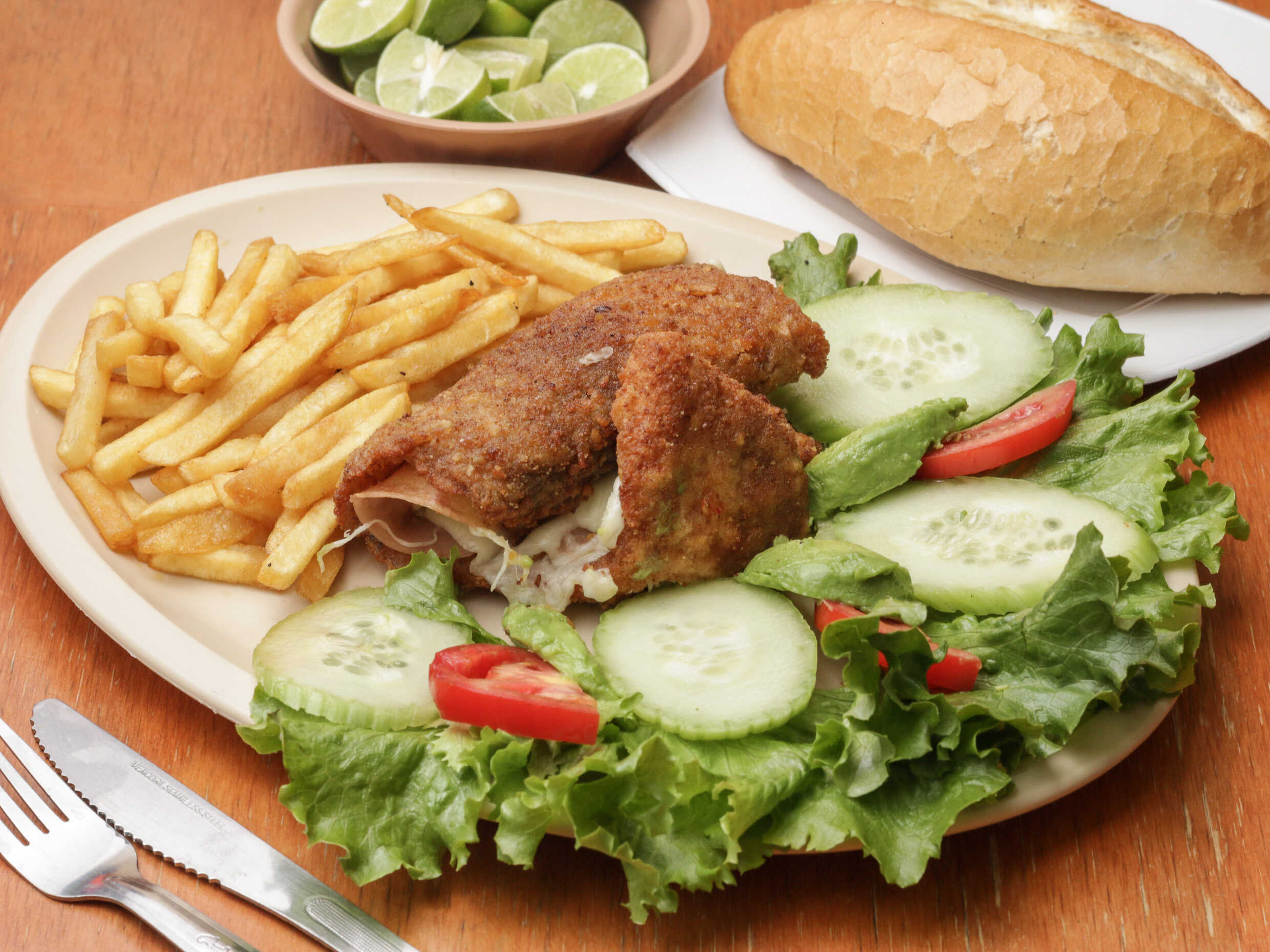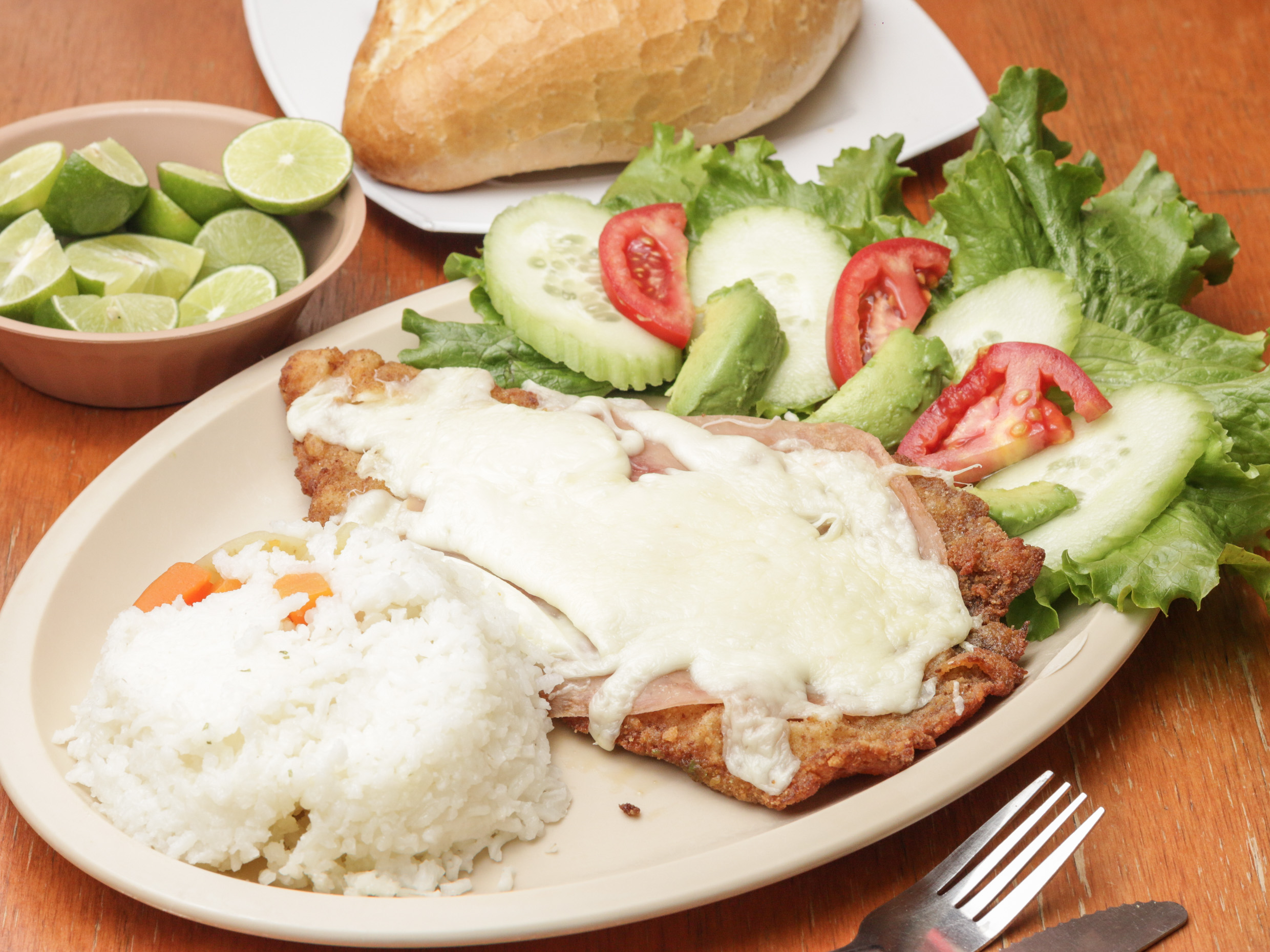 Filete de pescado empanizado, gratinado con queso oaxaca y jamón. Servidos con ensalada de lechuga fresca, pepino, jitomate y aguacate.